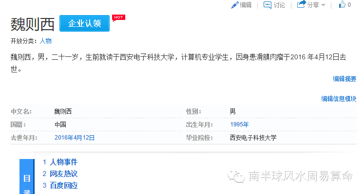 当我看到这一篇文章之后,惋惜这位青年才俊已经西去,祝愿他早登极乐,天堂没有痛苦。 然后本着研究学习的目的,我立即想找找这位青年的八字查看一下,理论上这样的病,八字上应该有一些信息。于是我找到了一些信息:在互动百科里面,我找到了他出生在 1995年。