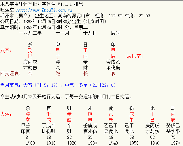 毛泽东八字赏析 一、毛泽东的生辰八字考 毛泽东为1893年12月26日生于湖南湘潭清光绪十九年,十一月十九日。农历癸巳年甲子月丁酉日韶山冲一个农民家庭。1976年9月9日在北京逝世。 毛泽东的生日,据《韶山四修族谱》卷十五记载:“清光绪十九年癸巳十一月十九辰时生。”即农历十一月十九日生。毛泽东身边的工作人员叶子龙等人,从历书上查对,将公历和农历对照,核定毛泽东的生日为12月26日。毛泽东曾风趣地说:“哦,我的那碗面条,此后不在阴历十一月十九日吃,改在阳历12月26日吃!” 二、毛泽东的生辰八字排定 根据毛泽东的生辰八字考,可以按照如下时间来排毛泽东的八字: 三:毛泽东的八字先天格局特性研究与分析 旺运哥:毛泽东的先天八字有几个主要特性,首先是阴阳平衡,木火土金水五行俱全,这一点是我要求八字学员首先要检查一个八字的首要步骤,而且互相辅佐稳固不杂,其五行之间互相制约平衡。另外是透杀藏官,透印而藏财,财印都临日干得用,官在月令又同样得用,即格局上财官印皆强而得用。而气象上藏伤官不伤官杀,皆为贵象。另外天干上形成双印扶住丁火,使本来生在冬季水月的火起死回生,同样为“水火既济”之象;阴阳保持比较大的相互对立和平衡之气势。所以可见毛泽东的八字是五行俱全,阴阳平衡,水火既济,而所有的五行都互相制约之中又能够做到不相互伤害;这是最为关键的一步。历来贵命的八字都害怕一字之差而破格,毛泽东也有比较破局的地方,但是却都不是致命的。下面将逐条分析。先展开分析下其八字的几个贵象: 1、毛泽东的左膀右臂辅助力非常大。 旺运哥:先天八字双甲木化水,官印得用可见,而双甲木皆为正印,同心协力而生扶毛泽东,因此毛的一生绝对不会“孤军在野”;用四柱八字原理,则贵命要重视核心在于吉利辅助;在毛泽东的八字上,则双甲木就充当了这个角色。如同一个人有左辅右弼的辅佐,一生的助力则特别大;双甲木如同左膀右臂,又怎能不逢凶化吉呢? 另外,转宫论法:其核心辅佐力在印,印临官位,则代表其助力印星本身根基也稳固,即辅助他的人自身格局也够大。大的格局来帮助更大的格局,他会更稳固,这是他一生的一个主象。 2、毛泽东的八字显示置于死地而后生。 旺运哥:1,日主丁火生于子月死地,唯其引旺于年支巳火故不枯,但与七杀相比较,明显身弱,身弱需印生,故此八字甲木正印与日主有情。2、丁日干(凡阴日干)无刃不能敌杀,其劫财也不能合杀;时支辰中虽藏有戊伤本可合杀,但戊伤既不透,又远离癸杀,另外辰土乃是水库,故辰土里面的戊土合癸水本身也无力,且上有甲印盖头,有合之心,无合之能。因此,唯一能化杀的只有月时上的两个甲木正印,它们左右鼎立于丁火日主身旁,化杀有力,这就形成了杀印相生而有情的八字格局。故此可见,此造用神相神皆为有情有力又清纯。这是决定此造格局高大的最根本最重要的原因。其次,年干七杀用神带太极贵人,年支巳火喜神带将星,日干丁火又为学堂、福星贵人、太极贵人、文昌贵人、天乙贵人,只是日支忌神酉金带空亡,纵观全局,几乎是满盘一等吉星。这就为此造的大格局锦上添花。所以命主才能贵为国家领袖。然而也许有人会问,此造为什么不能成大富呢?这是因为原局杀格用印,最忌财来坏印破格,所以日支酉财为局中忌神;财代表财富,所以命主与财富无缘,不能成富。而其在位时的一切行为规则。处处含有置于死地而后生之象。而其格局气势之大,也是能够直接领导中国起死回生。所以才也被当时的人们称为中国的大救星是有原因的。 如上所述,此造杀旺身弱,全靠二印化杀生身,并且这杀印有情有力,因此,这印在原局八字中就起着非常关键的作用;印为文,为著作、为学术、为知识……,所以主席在论文、诗词、书法、哲学等文化方面有着非凡的造诣,为历代帝王所难及。这为主席在人生道路上插上了腾飞的翅膀。 3.命中伤官不伤己。 旺运哥:关于毛泽东的八字,最有特色的我认为还不仅仅是以上两条。我们再看毛泽东的八字:年月为官印,而日时为伤官合财;前运当官;后运为伤官,即前面得权柄,后面有改革;而改革的方向在哪里呢?我们把伤官取象为代表创新,为改革。伤官在时辰,则就是毛的晚年革新。而很多人都说毛在文化大革命犯了很重要的错误,这个错误从命上看是很容易存在的,也即他命中的第一个瑕疵所在。 而我们都把伤官定义为凶星,伤官有两种阴阳含义的变化,以及两种利用方式。否则就没有“伤官见官为凶,伤官伤尽反为吉”的两种说法了,但这里我认为的其实还不是利用这两种用法,还有第三种:首先,一般来看,伤官在平民百姓那里就是容易触犯官星而犯旺,即说它容易招惹灾祸的根源,而其实那个命理规则是取自于常理的总结;因为普通人有伤官,则容易犯官,而自身没权没势没力气,怎么克得动官呢?即平民老百姓惹官怎么惹得起呢?所以,得罪不起官又要去惹官,就是“犯旺”,就要招灾。而伤官用在毛主席身上就不一样,他是自己本身为官,而官杀不受伤,有印化为文采和权柄,自然成格,其时辰的伤官则仅仅是晚年对其它官星的压迫,却并没有破坏自己的格局,所以其伤官在地支可以解释为“晚年及暗中对其它官星的伤害;这也是文化大革命的闹剧发生的“命理性原因”。而其八字关键点在于,自星始终伤害不了自己的格局,他星也