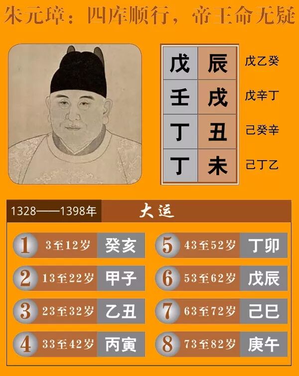朱元璋同志了,他的八字地支是辰戌丑未全,辰戌丑未全又叫做四库全,等于天下权利钱财都入库了,都可以归为己有,自然也是极贵之命。我记得去年有一个朋友在美国找我择日,我当时就是帮她选的就是辰戌丑未全的孩子八字: